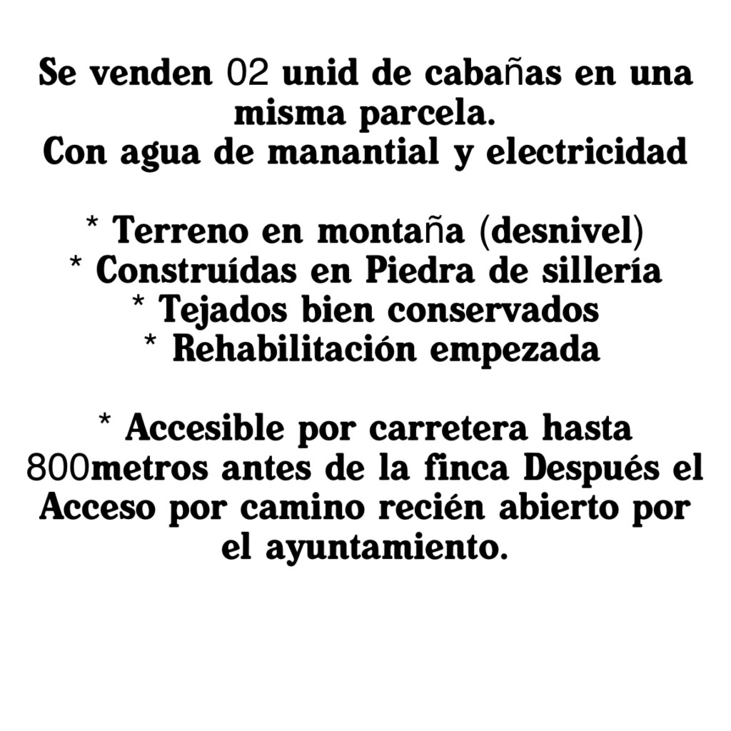 Se vende dos cabaña totalmente independientes en la misma finca, ambas en piedra de silleria, los tejados bien conservados e ya empezadas reformas de rehabilitacion. La primera cabaña mide aproximamente 120M2 siendo 60m2 por planta aprox., ya tiene instalación eléctrica dada de alta, el manantial está cerca de la finca. El tejado en buen estado, la madera de sostenimiento y de entre planta en muy buen estado, la planta baja bien limpia y con solera de hormigón. Tambien la tipica cabaña pasiega con dos puertas de entrada. Una para planta baja y para planta superior. La segunda cabaña ya empezada obras de actualización con paredes rejunteadas, tejado bien conservado, no tiene electricidad y está más cerca del manantial , tambien mide aproximadamente 100M2 entre las dos plantas, ventanas abiertas y tiene dos puertas de acceso. Si encuentra al final de finca, aprox 100mts de distancia de la primera cabaña. La finca está con terreno en desnivel. Para accender hasta la finca hay que percorrer el camino de tierra recientemente abierto por el ayuntamiento la distancia total del camino es aproximadamente 800mts para hacer a pie o en coche todo terreno(recomendable).La torre de electricidad está dentro de la finca al lado de la primera cabaña (como se ve el la foto) y la otra cabaña está a 100mts. La finca con grande parcela tiene vistas al valle de San Roque y el vecino más cercano está a 1km. Ambas cabañas están diafanas y tienem inúmeras posibilidades. LLamanos y conozca esta grande oportunidad de comprar dos cabañas por el precio de una. Listas para ser reformada y transformadas en las cabañas de tus sueños para disfrutar de paz y tranquilidad de las montañas en una de las zonas más bien valoradas de Cantabria.